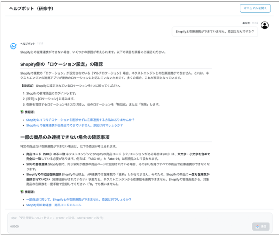 AIを利用したヘルプボットのため、自然言語でマニュアルを検索することが可能です。