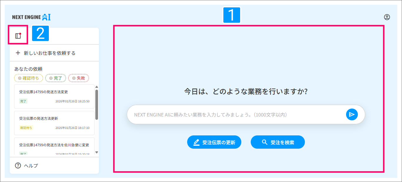 | 2サイドメニュー | クリックすると、入力された指示内容の確認・実行結果を確認できます。 |
