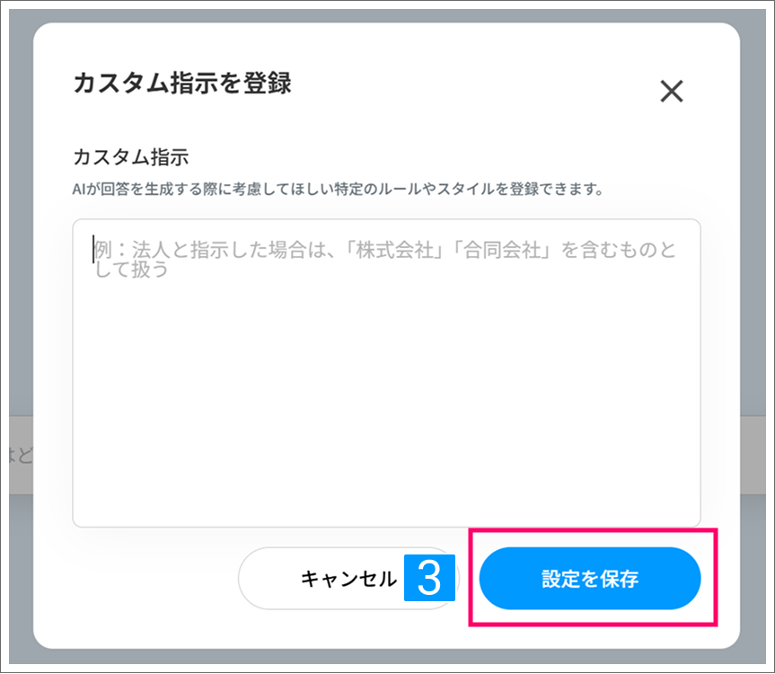 この設定を行うことで、毎回同じ指示を入力する手間が省け、自社の運用に合わせた回答を得られるようになります。