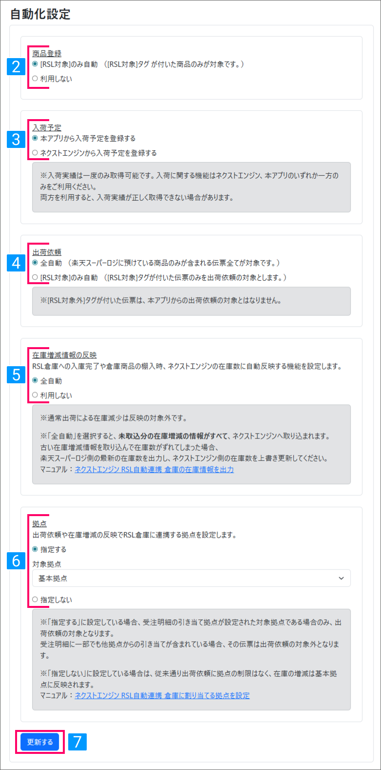 アプリから楽天スーパーロジへ自動連携を行う機能の選択、開始/停止を設定します。