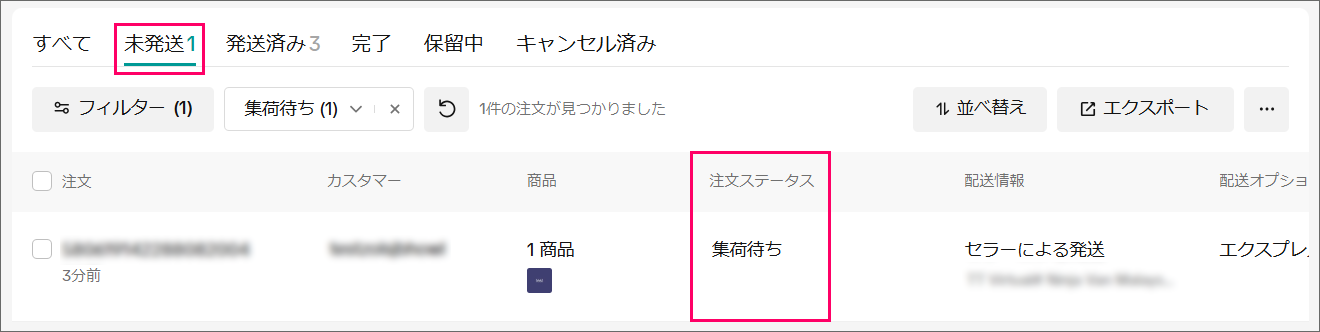 その後、注文から1時間経過+入金済みの注文は「発送待ち」へ移動します。