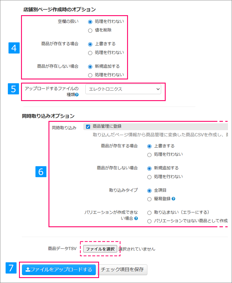 店舗の商品データを取り込むと同時に、本システムに登録済みの商品情報を上書きする場合、下記の4項目は上書きされません。