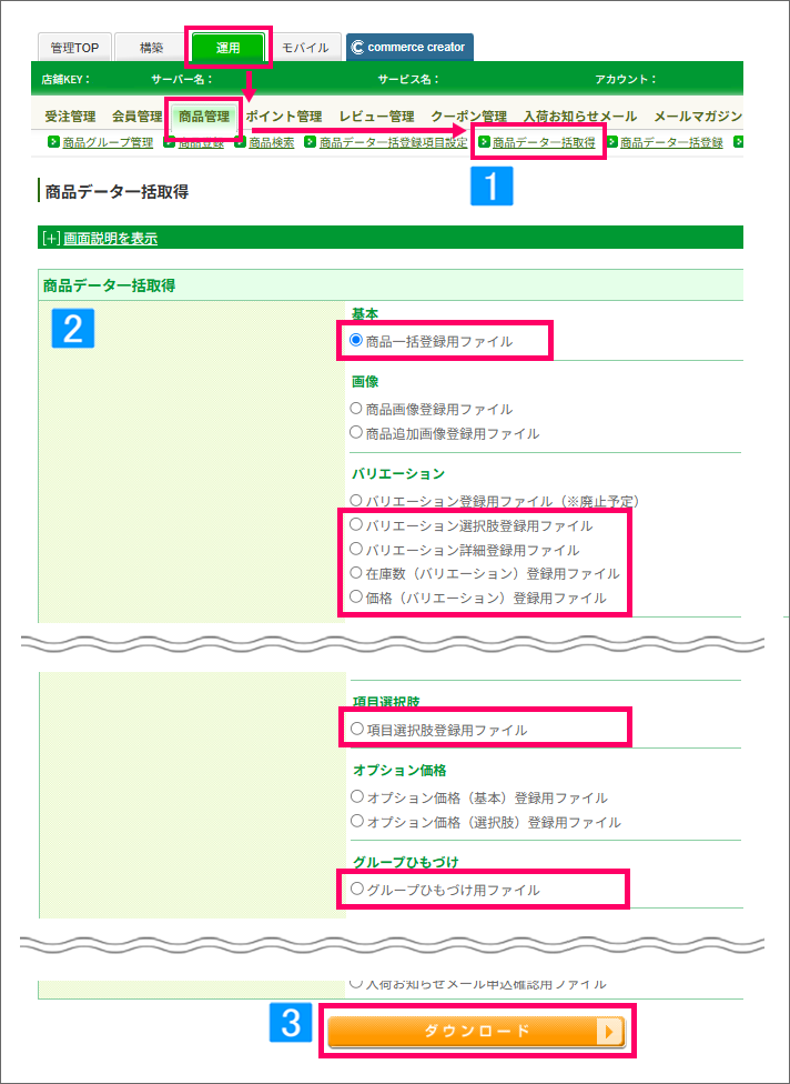 - [運用]→[商品管理]より[商品データ一括取得]をクリック