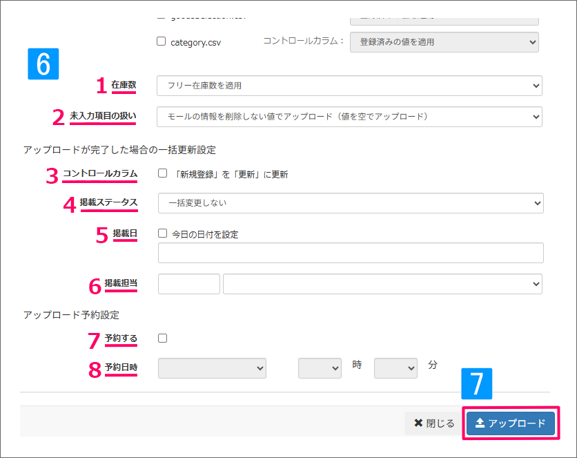 | 8 | 予約日時 | 予約アップロードを行う日時を指定します。 |